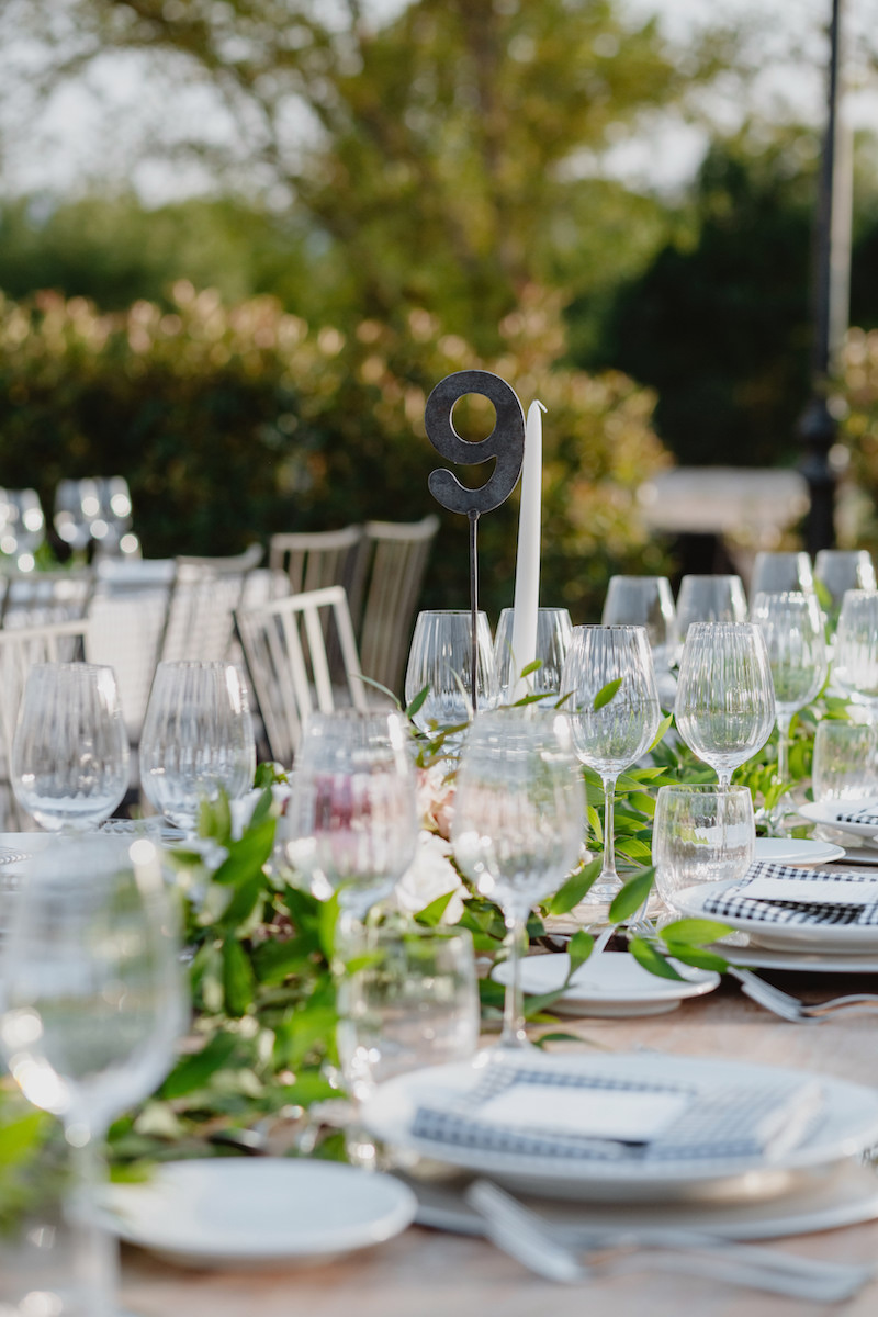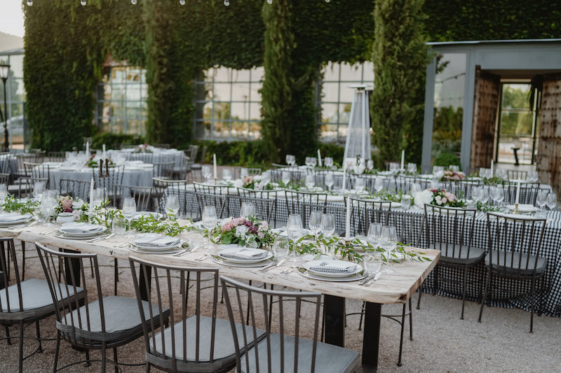 Por ello, en Bourguignon le propusimos a los novios una decoración con un aire muy natural y romántico, sin demasiadas pretensiones. En las mesas de madera vista: una guirnalda de verdes que aportaba aún más longitud a las mesas imperiales, mientras que en las que lucían el mantel vichy añadimos un centro floral muy romántico y femenino con rosas de piti-mini en tonos blanco y rosas, claveles, hortensias blancas y bayas de hipericum.